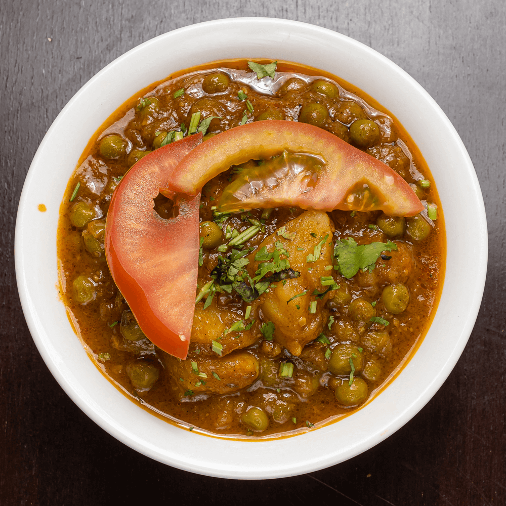 Peas and potatoes cooked with fresh diced tomatoes in a tomato-based curry.