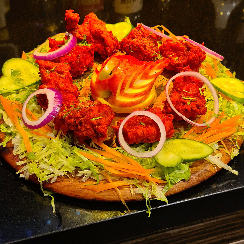 Barramundi fish fillets marinated with traditional aromatic spices and chickpea flour, deep fried to a golden color, served with mint sauce.